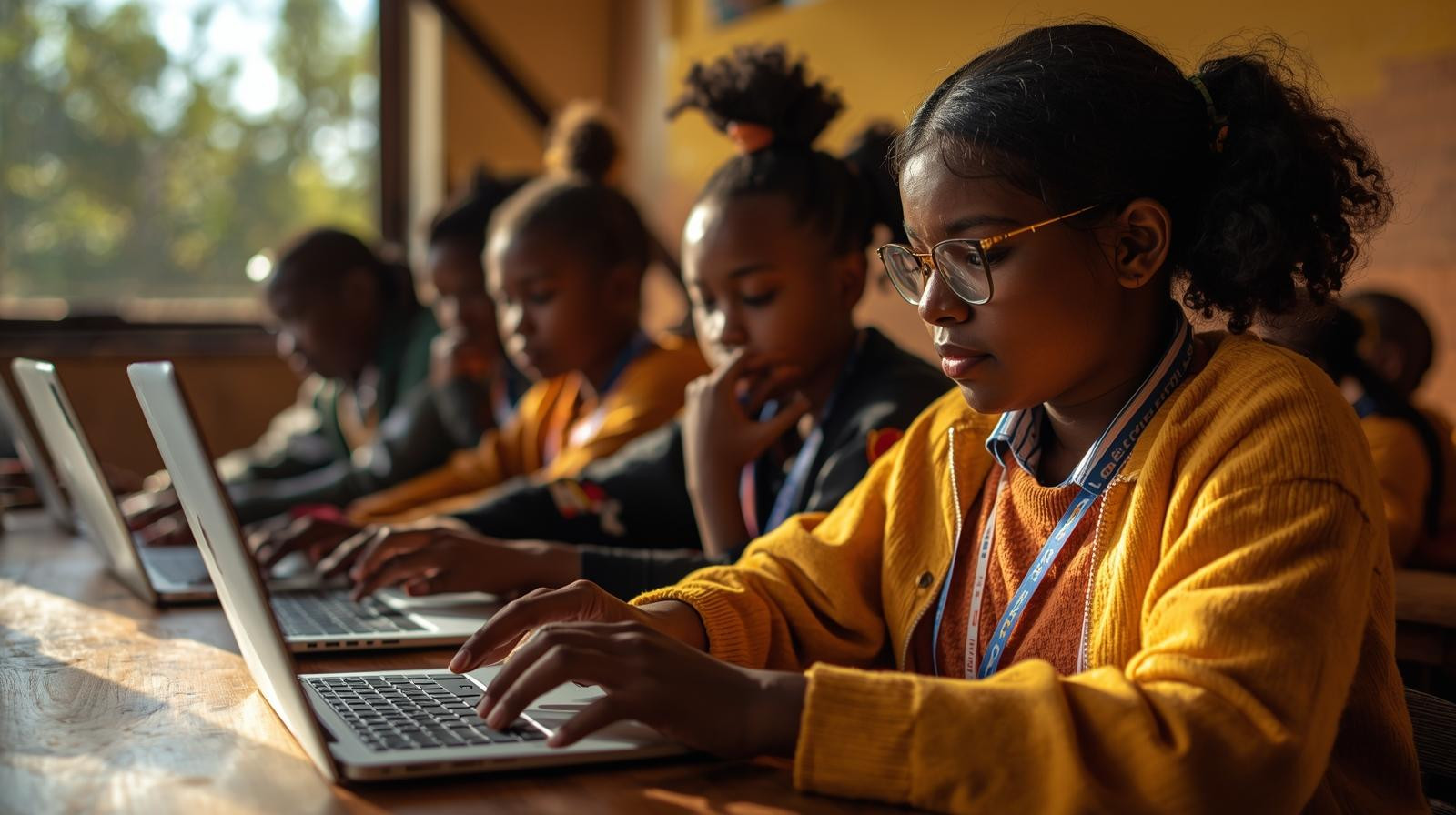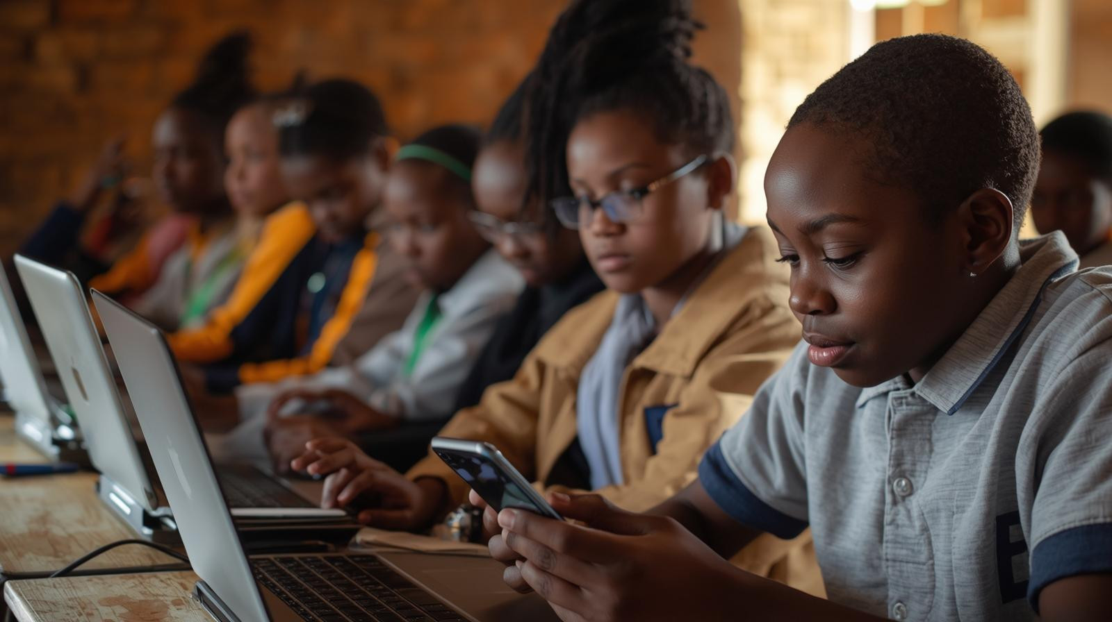 Young learners using laptops and tablets, engaged in digital learning, bright and inspiring.